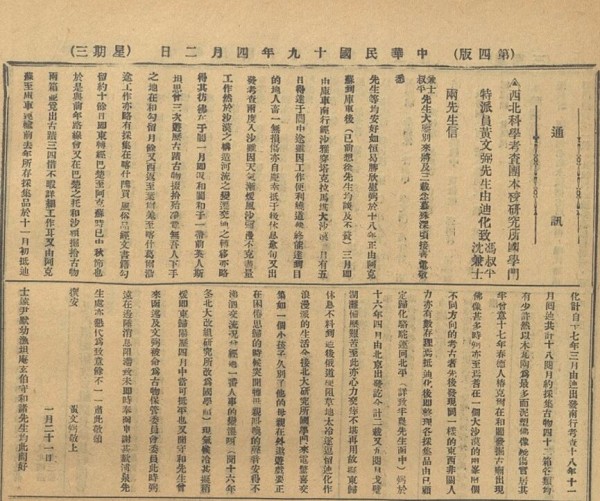 西北科学考查团本校研究所国学门特派员黄文弼先生由迪化致马叔平、沈兼士两先生信,刊登在《北京大学日刊》第2376号,1930年4月2日第4版。此信简单交代了黄文弼在沙雅等地的考古工作,以及黄文弼在新疆的采集品情况。同时表达了黄文弼对北大研究所国学门的思念之情和对被任命为古物保管委员会委员的感激之情。