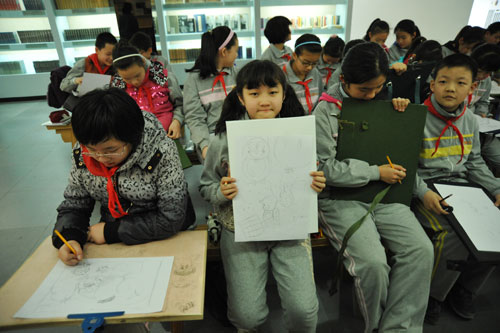 每一次活动结束,孩子们都徘徊在自己的画作前久久不愿离去,最后,每一个孩子都是笑着离开的,快乐的学习鲁迅,快乐的消闲文化,这也许就是“清明时节诵鲁迅”及“‘三味书屋’互动学习室”的意义所在。