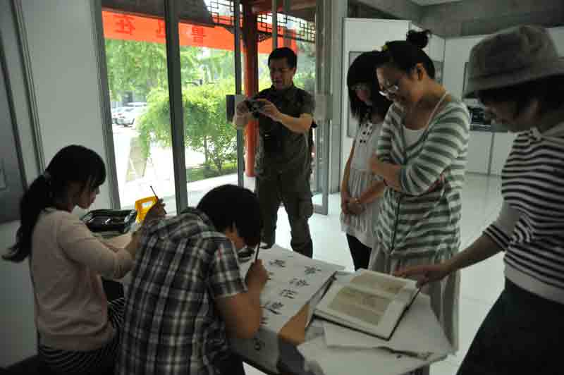 在博物馆日当天,中央财经大学文学院书法篆刻专业的同学现场为观众挥毫泼墨,赠送现场观众。艺术经纪、平面设计专业的同学在陈列厅纪念部分的朝华手艺坊指导观众现场复制鲁迅藏艺术作品及鲁迅作品封面画,两个志愿服务台观众挤得满满的,有观众还希望带回去的作品有志愿者的签名,他们都对志愿者的付出感到由衷的赞赏。“鲁迅可以很艺术”,这样的观点在志愿者的现场演绎下使观众们更能真切的体会到了。看着观众高兴的把自己的劳动成果带走,一位志愿者高兴的说:“这样既练习了书法,又能给别人带来文化的滋养,这样的活动真是太好了。”