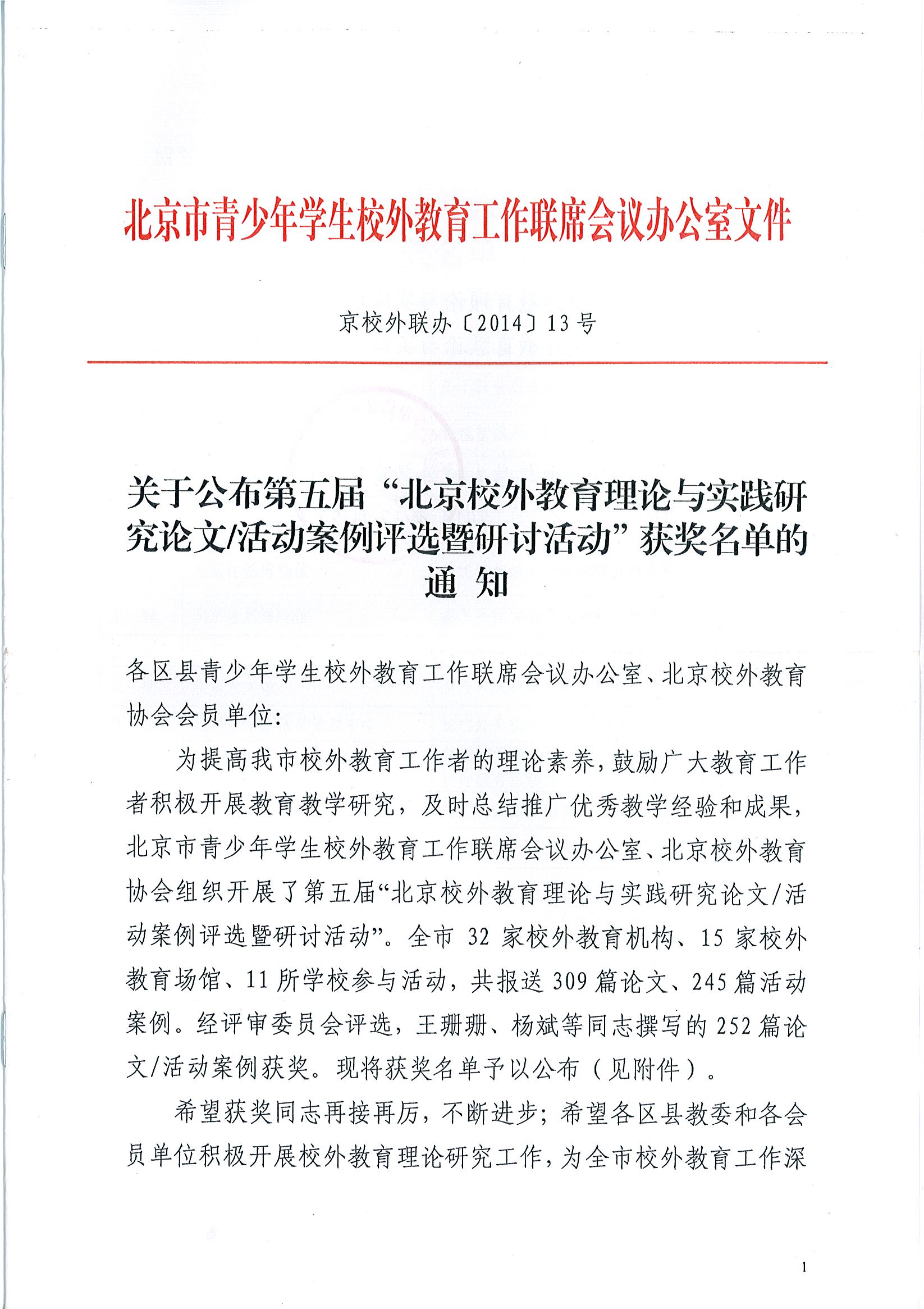 根据北京市青少年学生校外教育工作联席会议办公室通知,我馆社会教育部刘晴同志撰写的“三味书屋互动学习室方案”荣获“阳光少年活动优秀案例”二等奖。