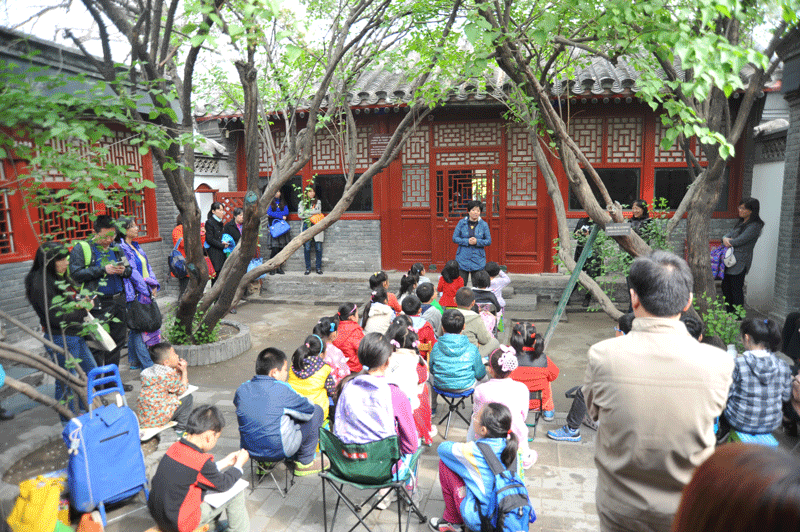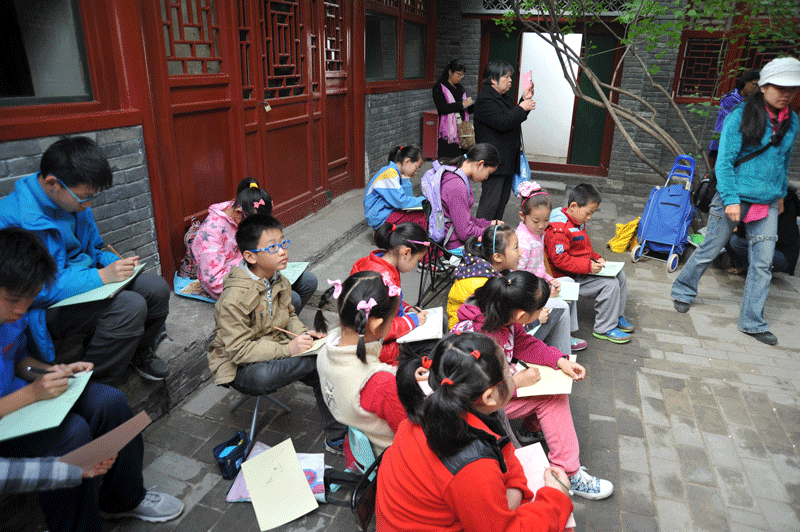 展览路属于西城区,孩子们和同为西城人的鲁迅可是不折不扣的“小邻居”,在丁香花海的沐浴下,进行了一次以“鲁迅与四合院”为主要内容的美术教育活动。首先,北京鲁迅博物馆的老师为孩子们讲述了鲁迅在西三条21号居住期间的生活,介绍了鲁迅居住期间西三条胡同的风土民情、四合院建筑结构和老北京文化的基本知识。其后,孩子们在美术老师的指导下,在鲁迅旧居内进行现场写生
