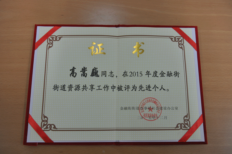 2015年12月9日,在北京市西城区金融街街道办事处举办的“资源共享总结交流会”上,北京鲁迅博物馆(北京新文化运动纪念馆)荣获“金融街地区资源共享先进集体”荣誉称号,社会教育部副主任高嵩巍同志被授予“2015年度金融街街道资源共享先进个人”。颁奖仪式后,社会教育部馆员刘晴同志作为资源单位先进代表在大会上发言,介绍了我馆一年来在与社区、学校等教育机构资源共享中的先进经验。
