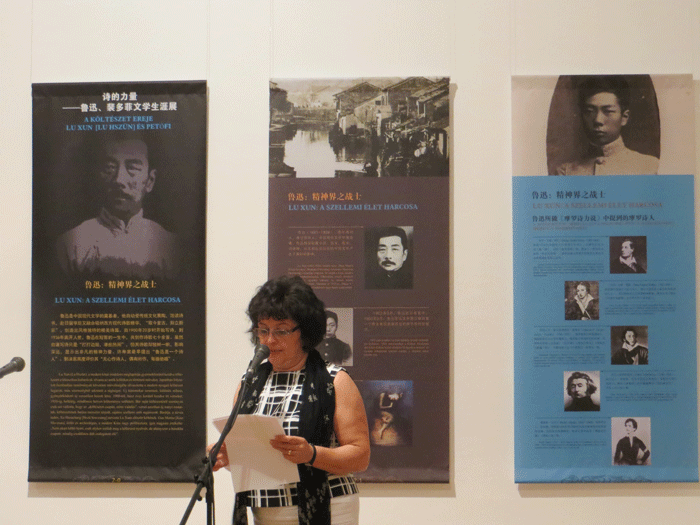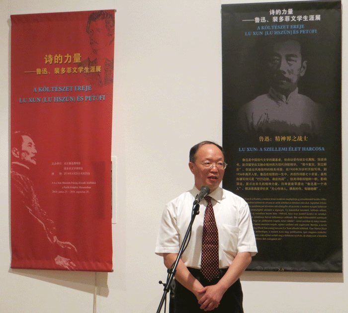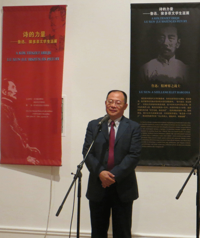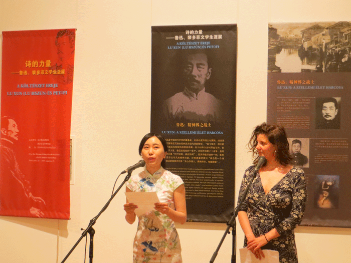 展览开幕式以中匈两位代表分别以汉语与匈牙利语朗诵裴多菲的诗歌《我愿意是急流》与《自由与爱情》开始。郭晓光参赞在讲话中高度评价“诗的力量——鲁迅、裴多菲文学生涯展”在中匈两国人民之间弘扬了宝贵的爱国精神与民族精神,对东西各国人民来说都非常重要,因为它传承了民族之魂。他感谢中匈双方工作人员所作出的努力,希望今后两国有越来越多的朋友参加到这个行列中来,通过文化活动架起文化之桥,加深中匈双方的了解,为世界和平与繁荣作出努力,这样的盛景也是鲁迅与裴多菲两位文学大师所希望看到的。