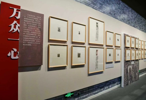 展览设计融入代表性版画元素,尤其突出李桦1935年创作的经典之作《怒吼吧!中国》,紧扣展览主题。主色调选用深红、灰黑与原木色等富于历史质感的色彩,营造民族危难时刻的压抑氛围,同时彰显以生命和血肉熔铸的艺术力量。展览空间亦突破室内局限,延伸至户外,通过在斑驳粗糙的墙面上以油墨再现战斗场景,还原“十字街头”传单式抗战宣传形式,引领观众仿佛重回艰苦卓绝的烽火年代。